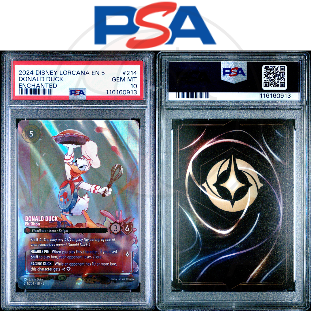 This Enchanted Donald Duck – Pie Slinger from Disney Lorcana: Shimmering Skies (EN5) is a stunning parallel rarity, graded PSA 10 GEM MINT. With vibrant foil artwork by Gabriel Quinn and powerful lore-draining abilities, this card is a top-tier collectible for fans of Lorcana and classic Disney.