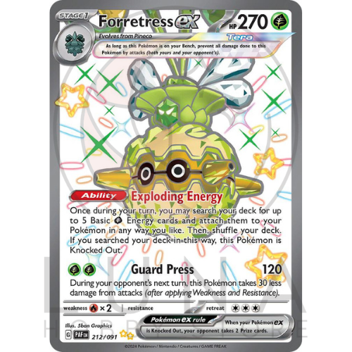 🌿💥 Harness explosive strategy with this full-art Forretress ex from Paldean Fates! This Grass-type Tera Pokémon boasts a powerful energy acceleration combo and shines in brilliant Illustration Rare foil with a fun, pop-art starburst background.