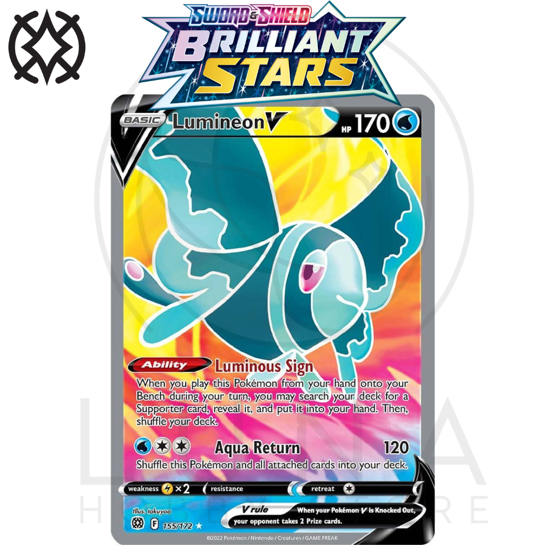 🌊 Add the elegant Lumineon V to your Pokémon TCG: Sword & Shield Brilliant Stars collection! Known for its stunning artwork and competitive utility, Lumineon V’s Luminous Sign Ability lets you search your deck for a Supporter card instantly, making it a must-have card for collectors and players alike.