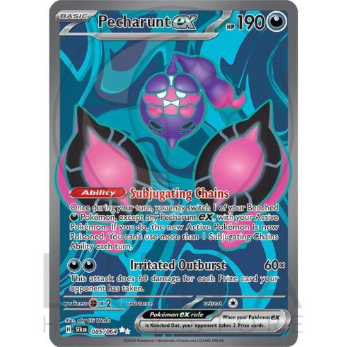 Unleash the sinister power of Pecharunt ex in full, Illustration Rare glory from Shrouded Fable! With hypnotic background swirls and glowing chains, this Mythical Pokémon makes a visually stunning and strategically disruptive addition to your dark-type deck.