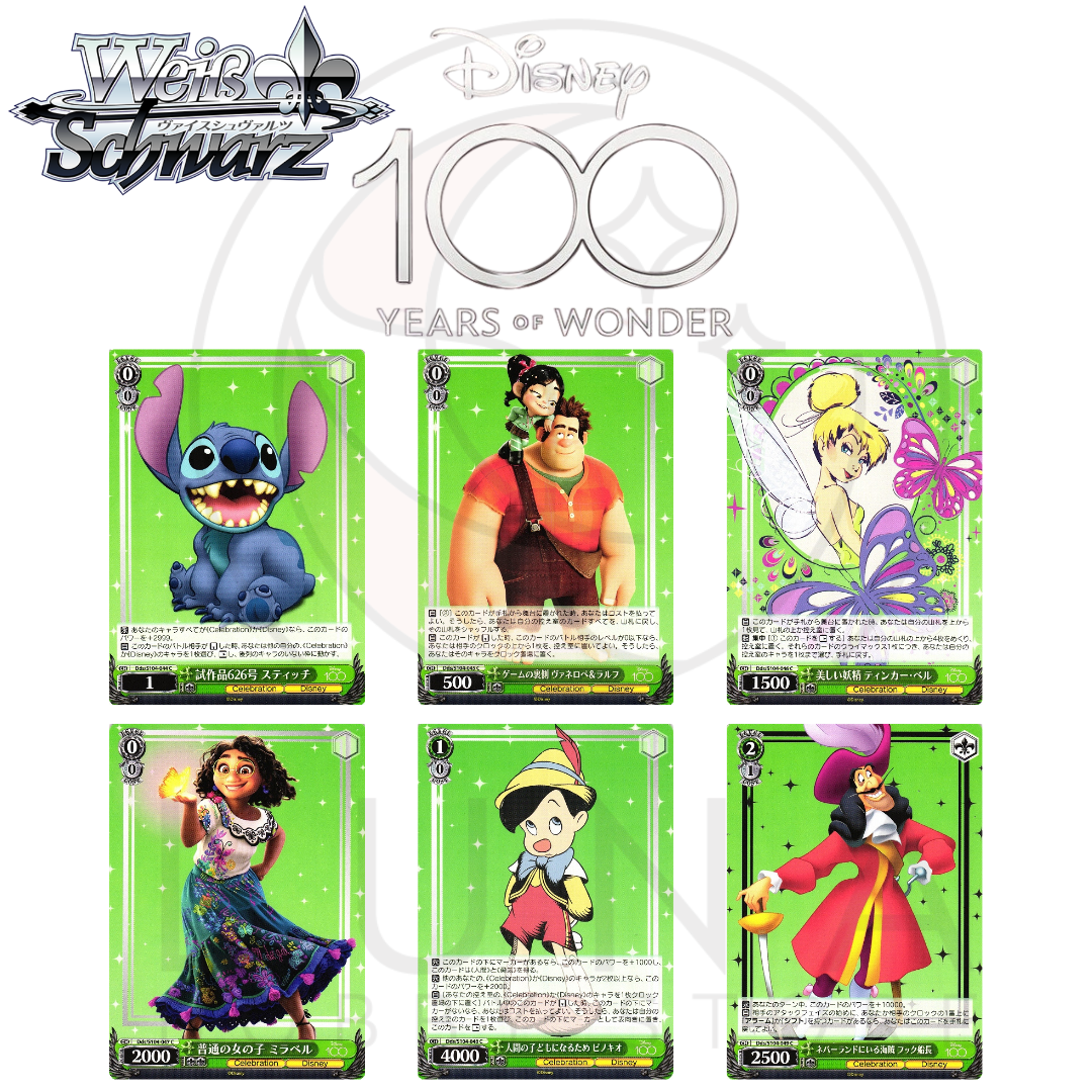 The Weiß Schwarz Disney 100 Years of Wonder Green Commons feature a mix of beloved Disney characters from timeless classics and modern hits. Perfect for collectors and players looking to add a touch of Disney color to their decks.