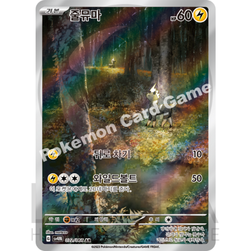 Deep in a glowing forest, 줄뮤마 (Blitzle) stands alert — caught in a rare, quiet moment of light and shadow. Illustrated by matzo, this Art Rare captures stunning rainbow light filtering through trees, creating a dreamlike and serene Pokémon moment.