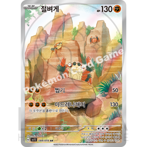 절벽의 수호자 등장! 절벼게 (Klawf) is perched proudly among towering red cliffs in this gorgeously painted Art Rare from Scarlet ex. Illustrated with naturalistic charm by Mina Nakai, this card captures the rugged beauty of Klawf’s rocky domain in the Korean release.