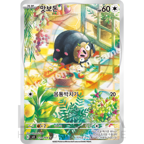 A gentle foodie moment with 맛보돈 (Lechonk)! Nestled among fruit bowls and potted plants, this sleepy Pokémon naps peacefully in a sunlit room. Illustrated by Narumi Sato in soft watercolors, this Art Rare is a cozy delight from the Ruler of the Black Flame set.