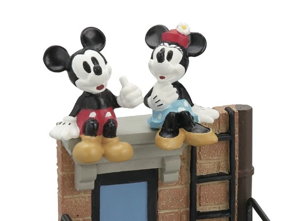 🏙️ Features Mickey & Minnie perched on a brick-style rooftop ledge