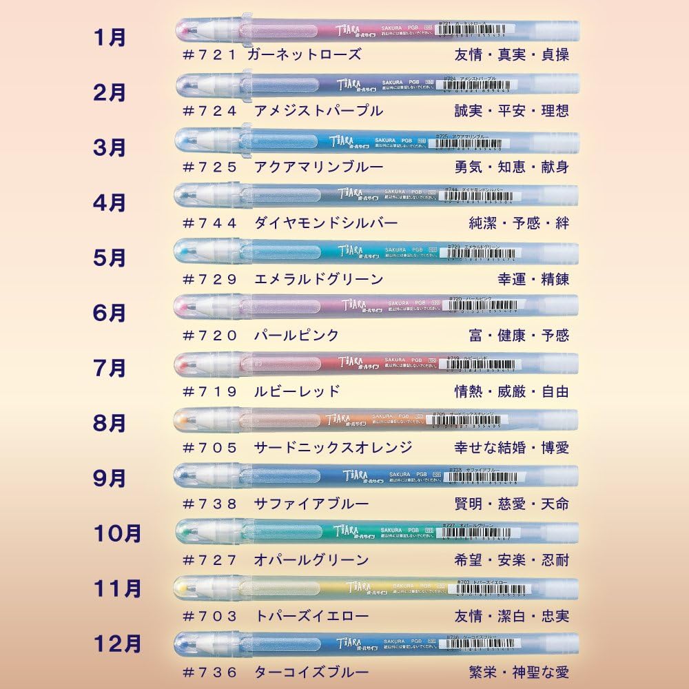 ❤️1月 (Jan) Garnet Rose (#721 ガーネットローズ), 💜2月 (Feb) Amethyst Purple (#724 アメジストパープル), 💙3月 (Mar) Aquamarine Blue (#725 アクアマリンブルー), 🤍4月 (Apr) Diamond Silver (#744 ダイヤモンドシルバー), 💚5月 (May) Emerald Green (#729 エメラルドグリーン), 🌸6月 (Jun) Pearl Pink (#720 パールピンク), 🔴7月 (Jul) Ruby Red (#719 ルビーレッド), 🧡8月 (Aug) Sardonyx Orange (#705 サードニックスオレンジ), 🔷9月 (Sep) Sapphire Blue (#738 サファイアブルー), 🍃10月 (Oct) Opal Green (#727 オパールグリーン), 💛11月 (Nov) Topaz Yellow (#703 トパーズイエロー), 🩵12月 (Dec) Turquoise Blue (#736 ターコイズブルー)